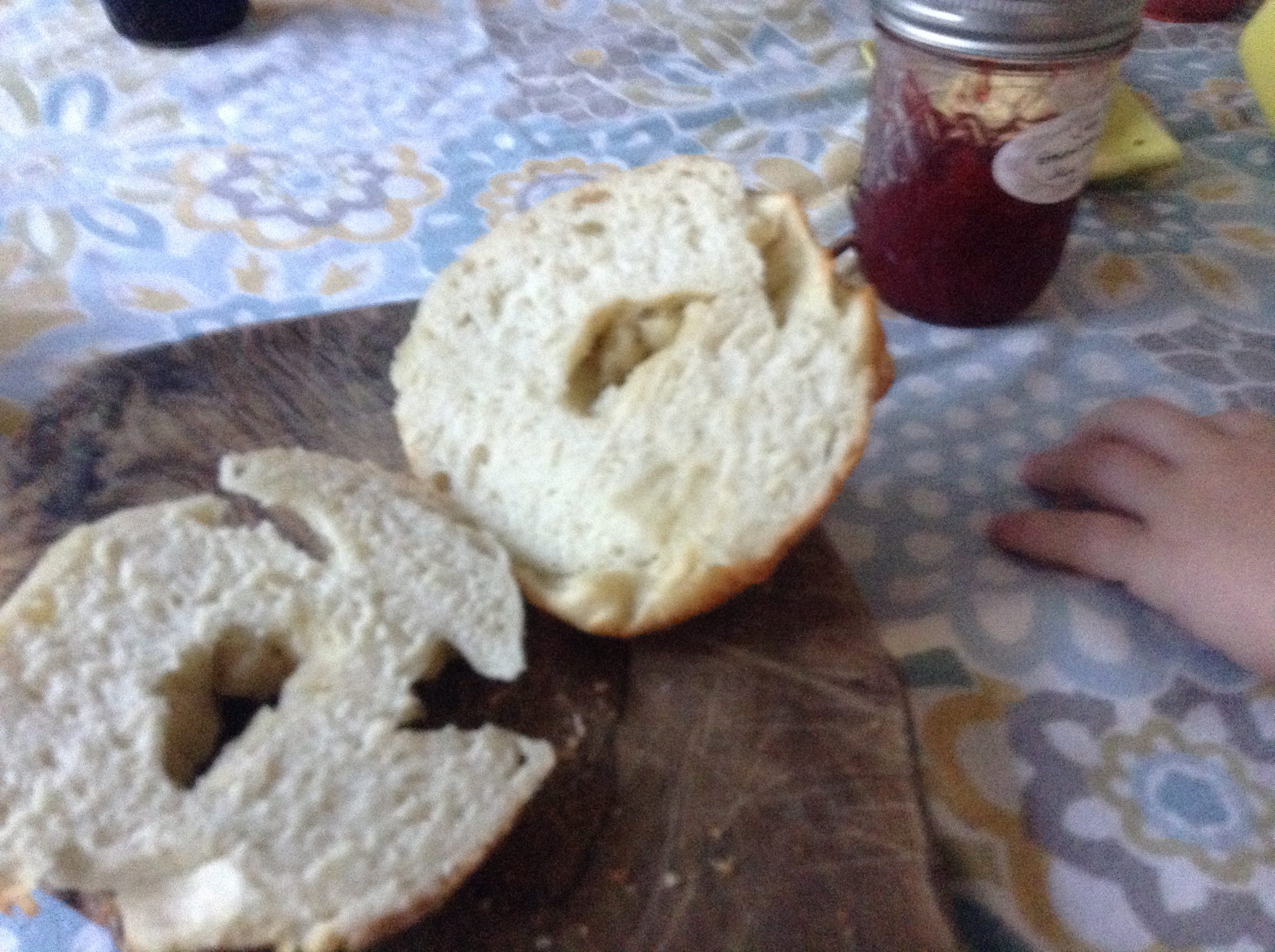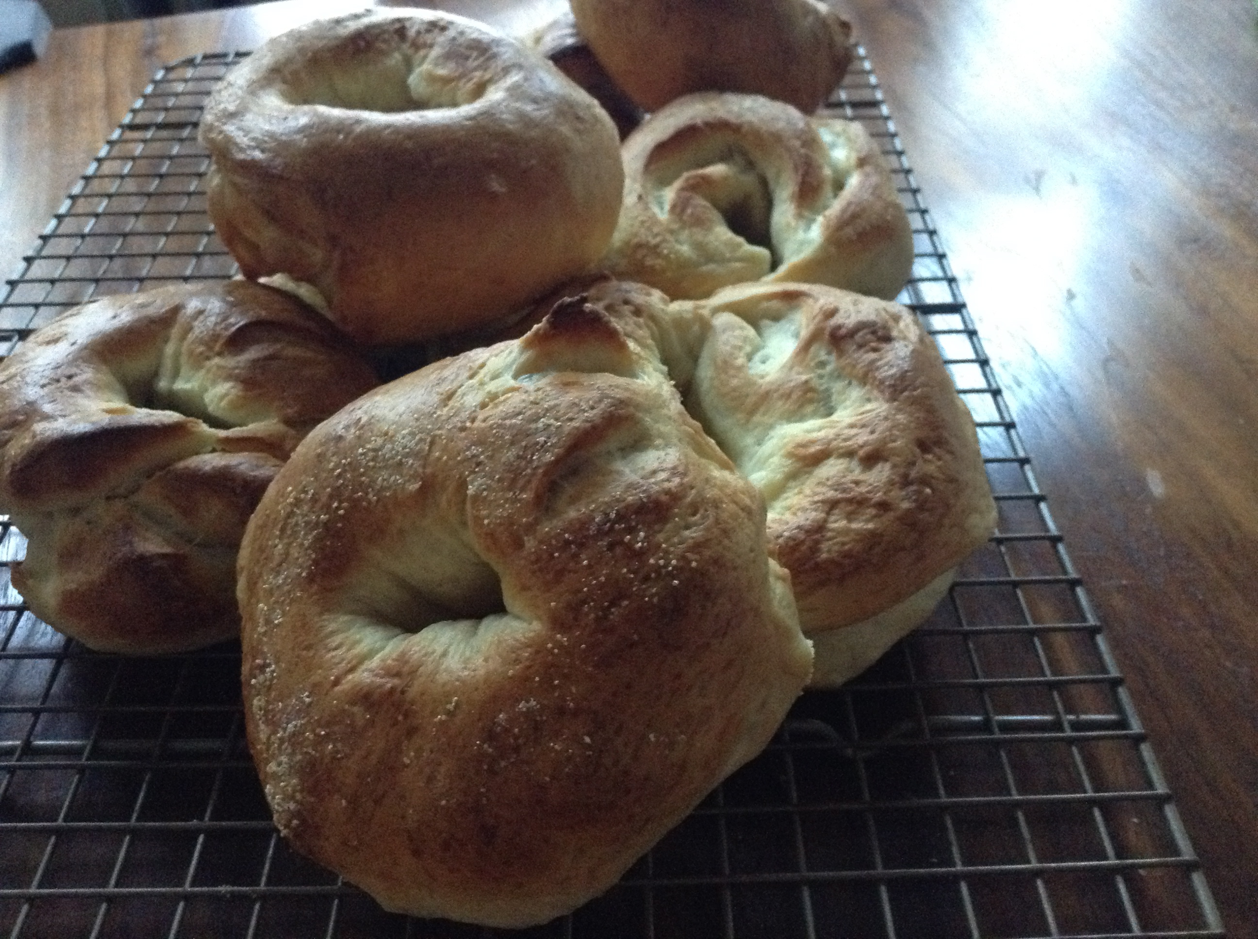 What happens in our house when…we run out of oatmeal and grocery cash? I go into crazy baker mode. What can we have for breakfast? What ingredients do I have? What will make these next four days fun and challenging? Bagels. Duh.