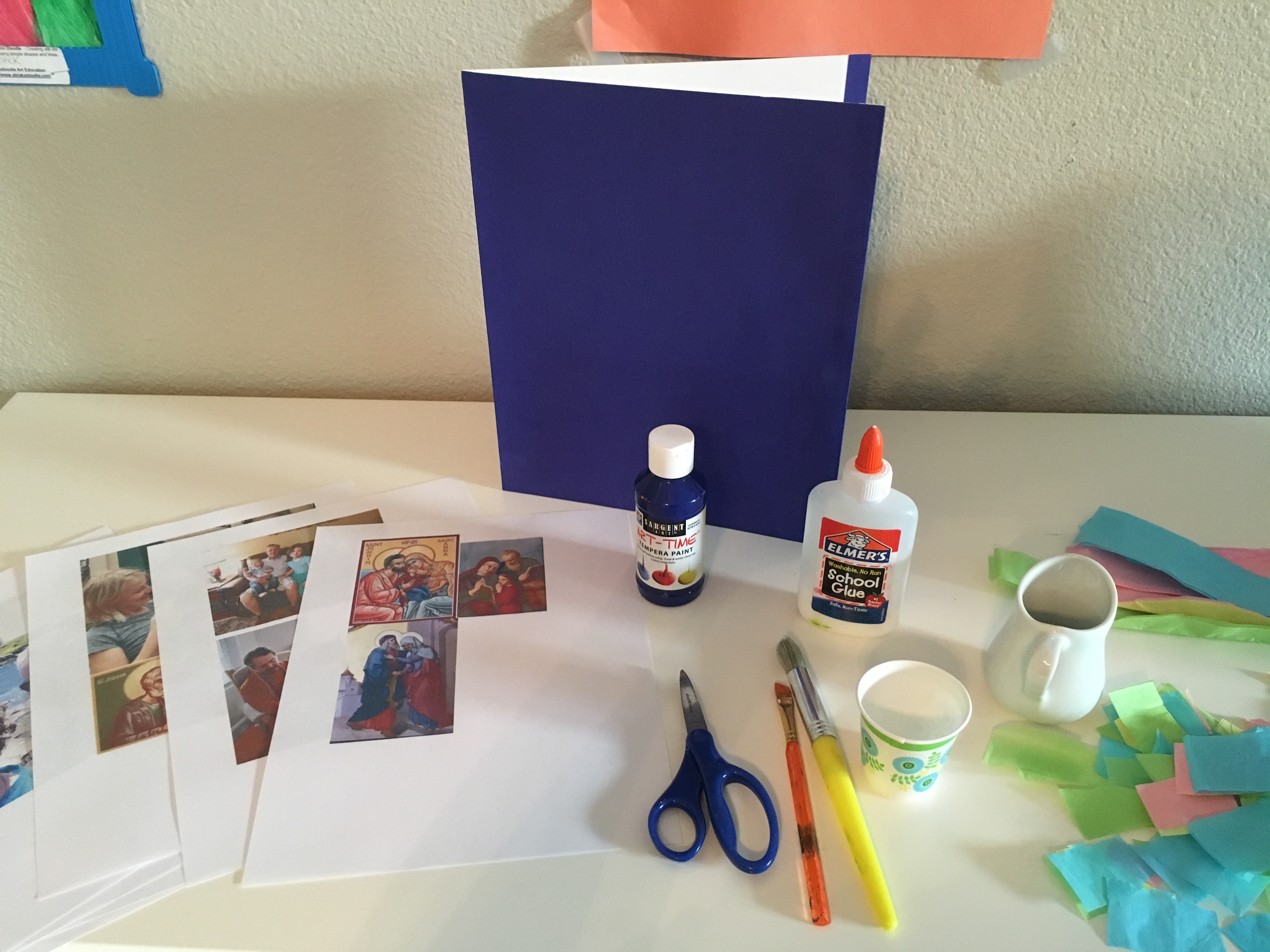 Materials: cardboard, poster board, an old folder, something sturdy!; paint, glue, tissue or color paper cut into small squares; printed images of Sts. Anne and Joachim or holy cards of them, photographs (work best) or printed images of your grandparents.