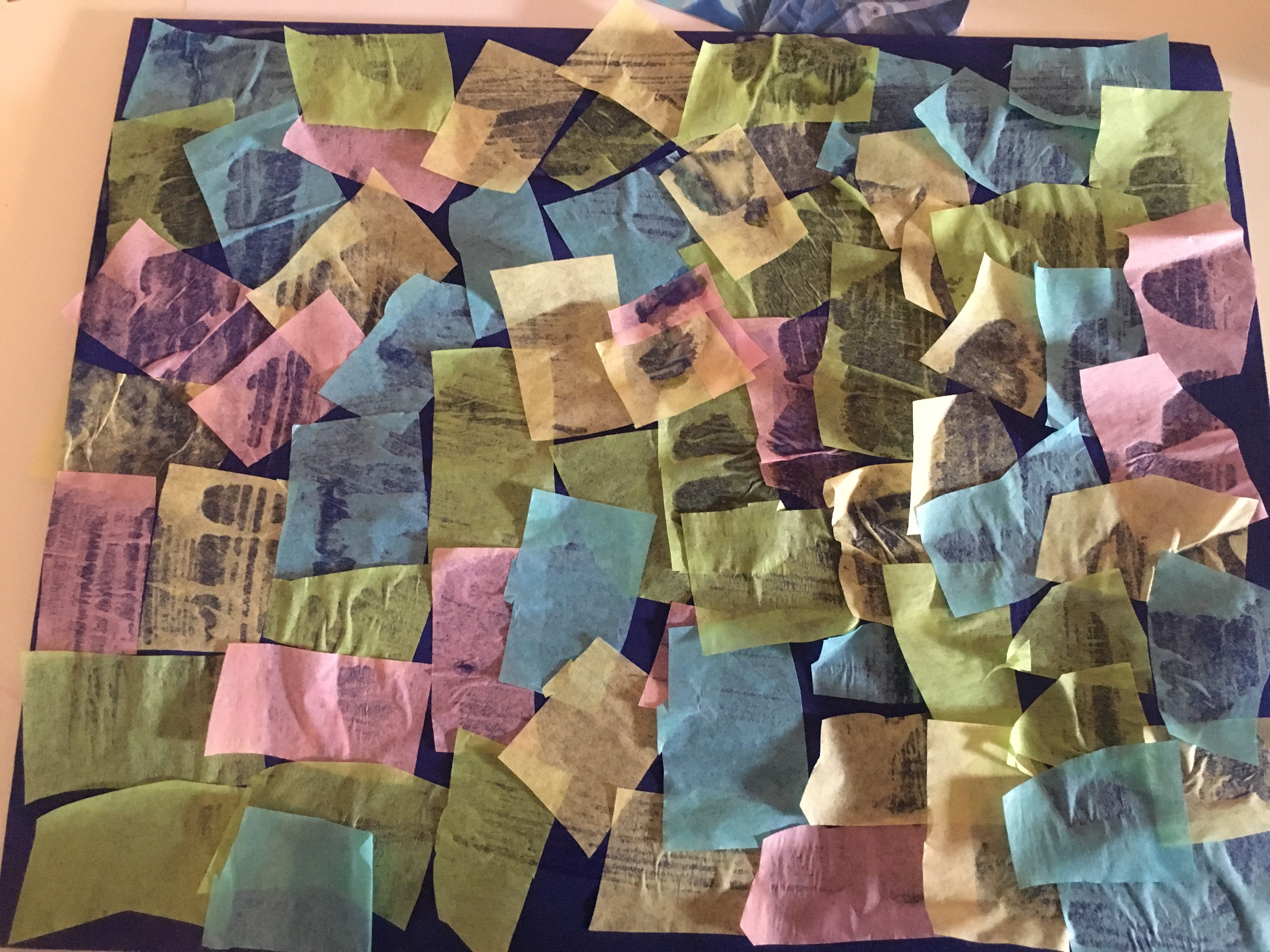 - Before the paint dries help your children press on squares of tissue paper to make a collage of color (it may look like stained glass window!). If the paint begins to dry use a little glue to affix the squares.
