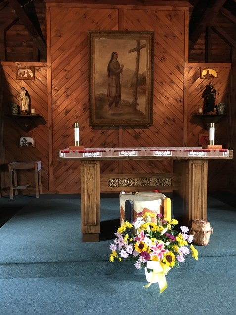 Altar, drum and artwork at the chapel of the Kateri Shrine.