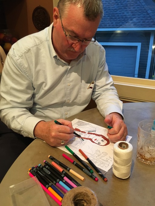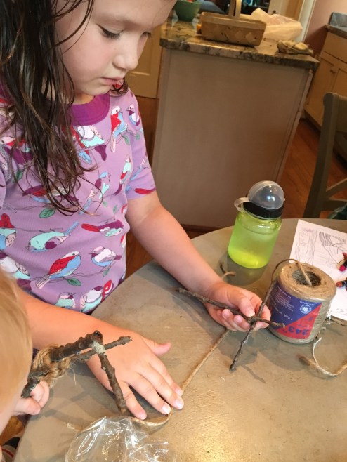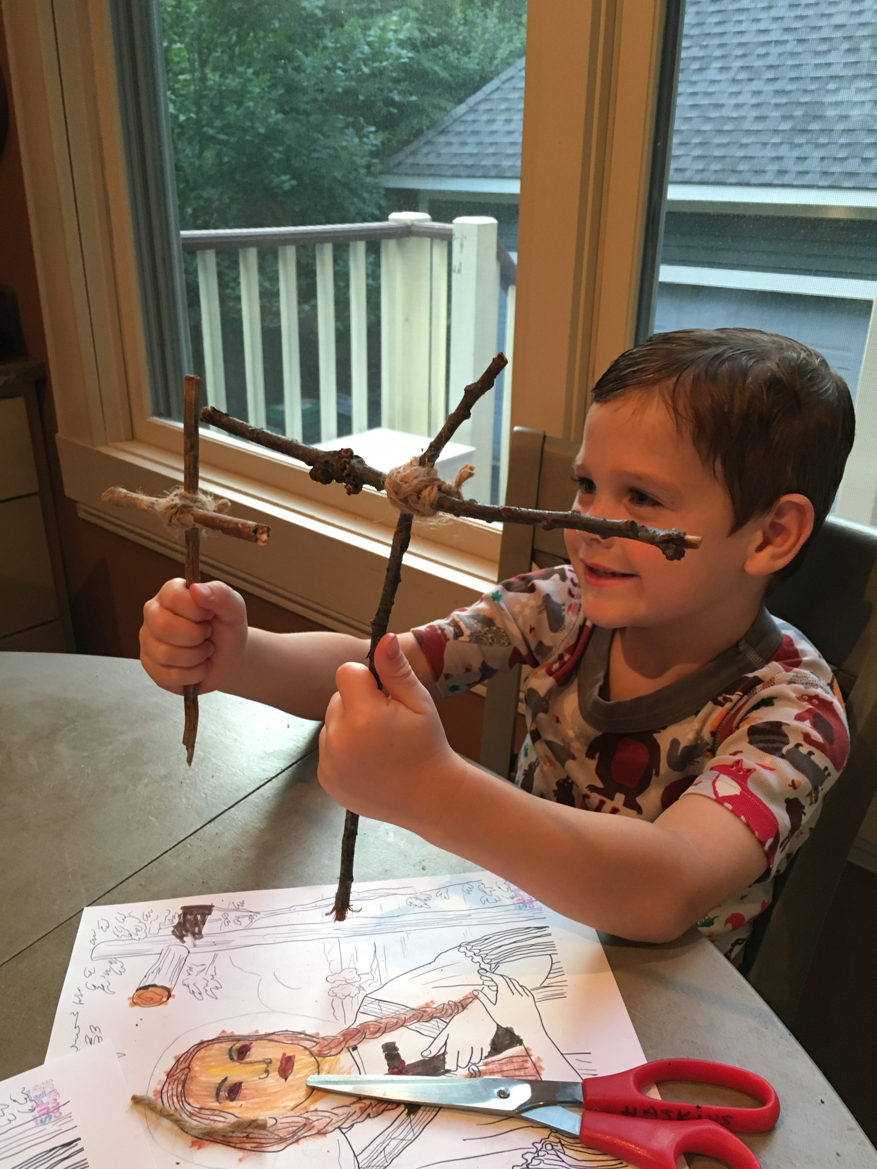 And after bath and brushed teeth we sat down to make our crosses on the way to night prayer. It was really in the breath of a moment that these things came together. They were sitting around, waiting for prayer time. There were the sticks, we found some twine, and it fell easily into place. The coloring pages were out on the table all afternoon. An invitation to color this time instead of a sit down together activity.