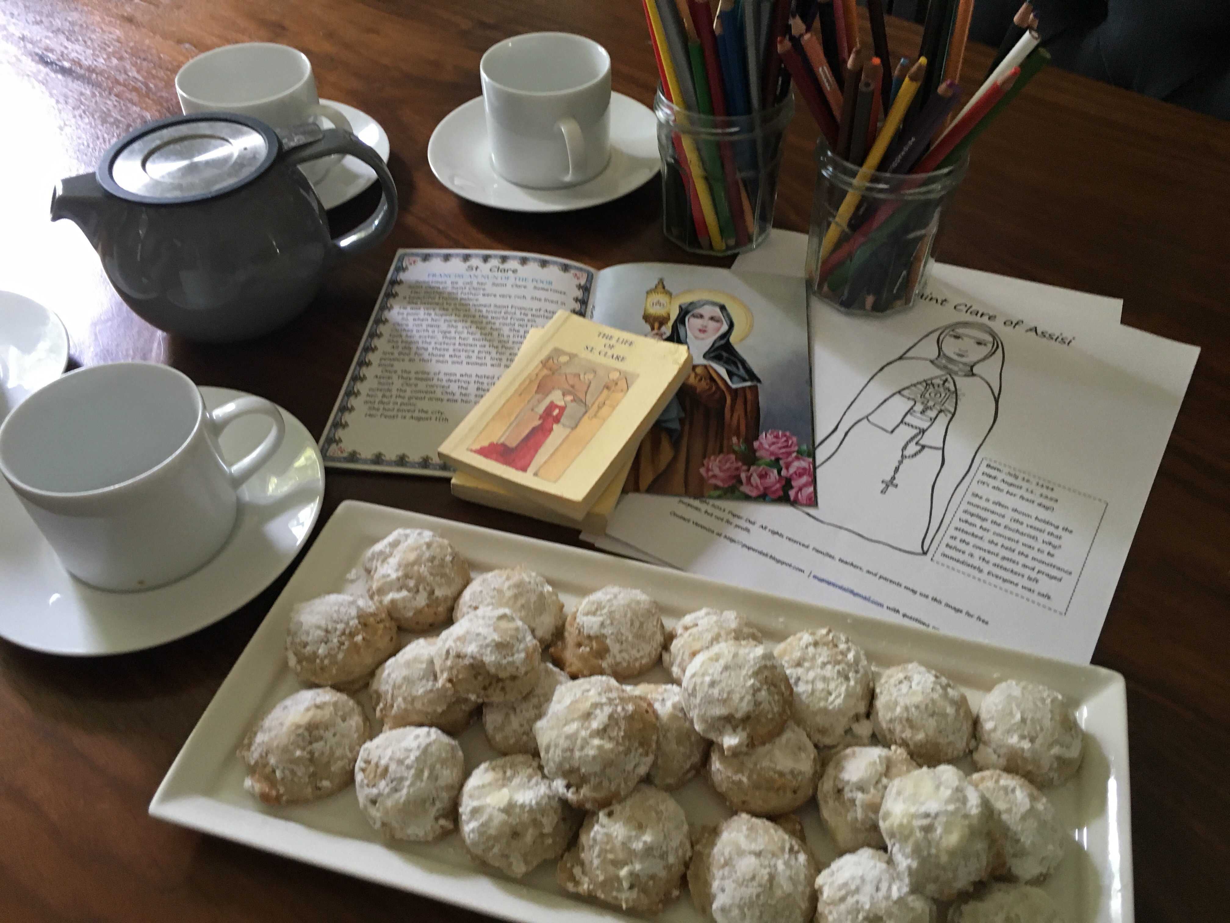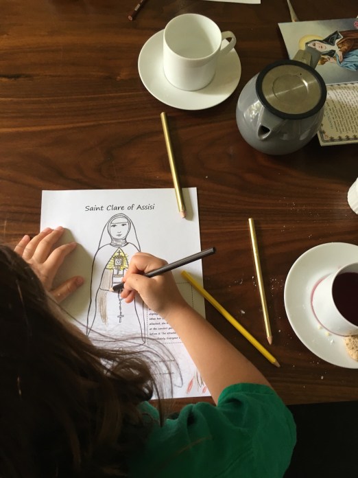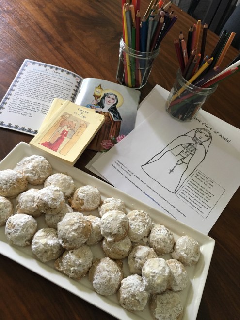 Starting at tea time means beginning with the prayer. We prayed our usual before meal prayer and asked for the intercession of St. Clare. Then we poured (ladies first!), helped ourselves to cookies and munched while I read from the Miniature Stories of the Saints book on St. Clare. The children had a lot to ask and say about St. Clare saving the city!