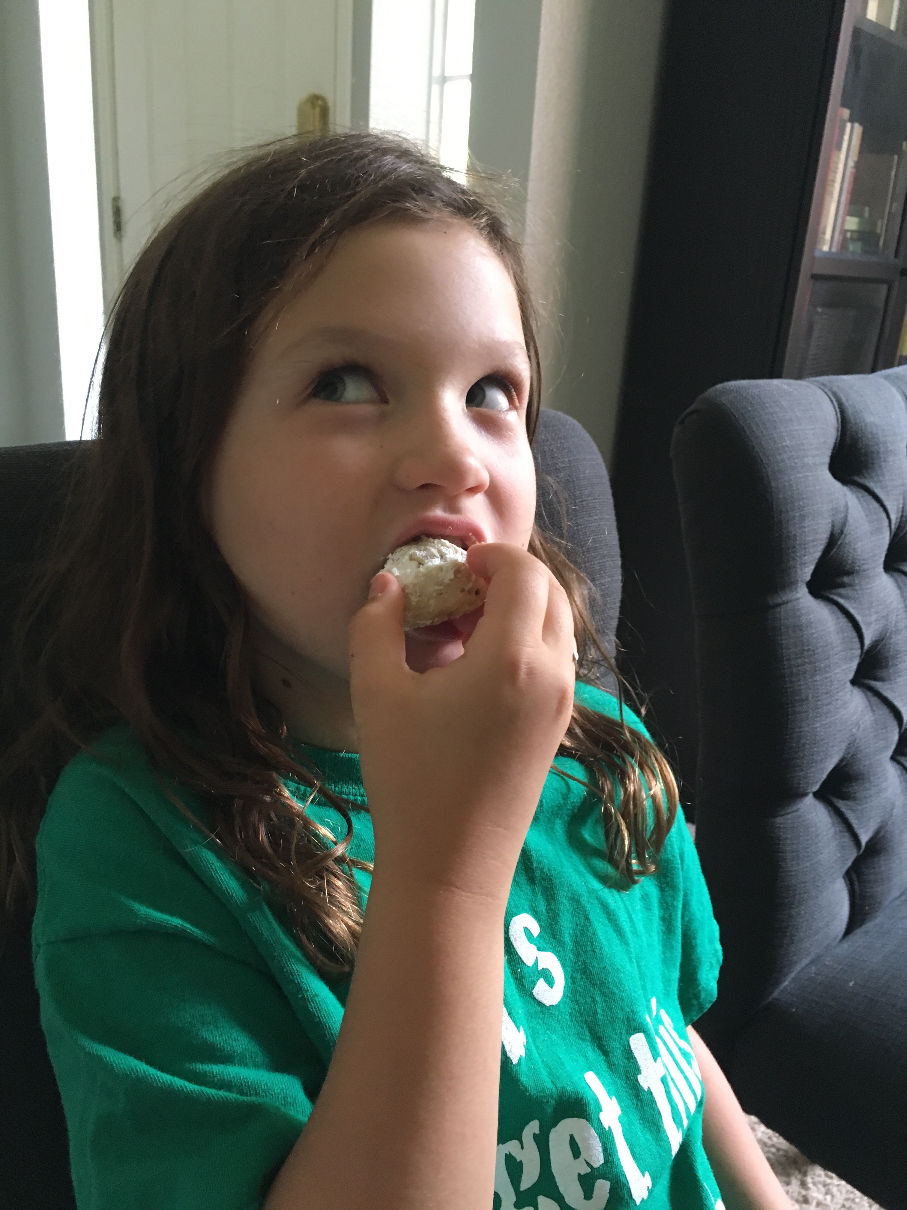 And, you guys, those Italian Wedding Cookies, are too delicious and too easy to make. Like too easy. We whipped them up together in about 5 minutes. And they’re bite sized, so I lost track of how many I popped before we even sat down. I halved the recipe I shared in the plan this time around, cause today’s also daddy-o’s birthday. There are custards in the oven for his birthday dinner tonight. Please, set custards. I didn’t make a full batch of cookies!!!