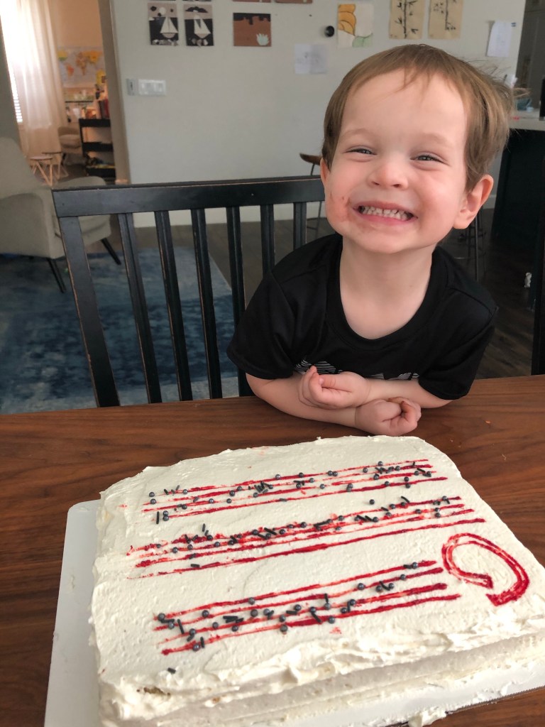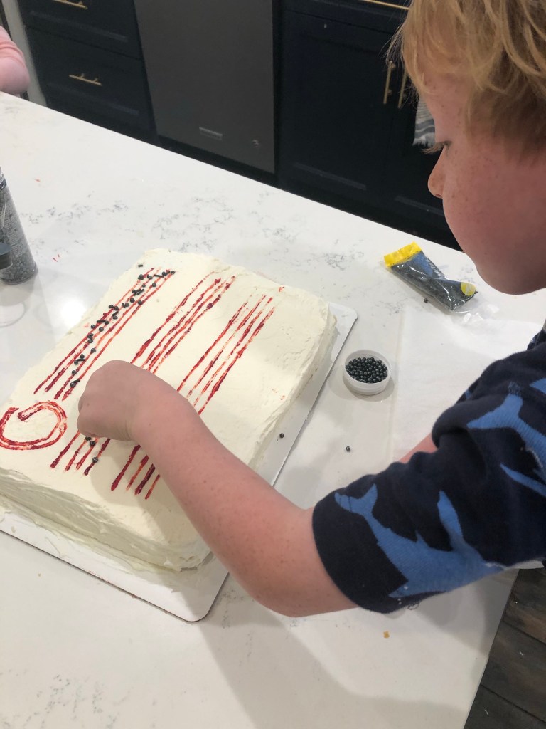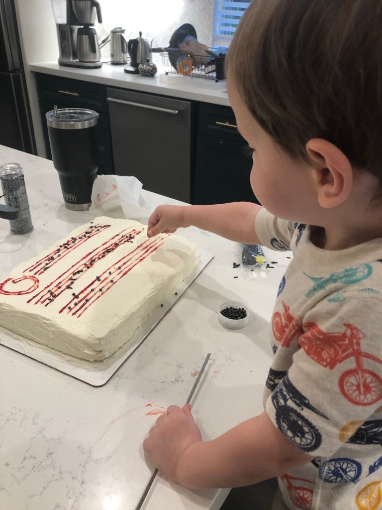 I was able to prep the cake yesterday in order to make today’s happening go more smoothly. This morning the wee three helped to decorate.